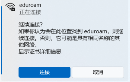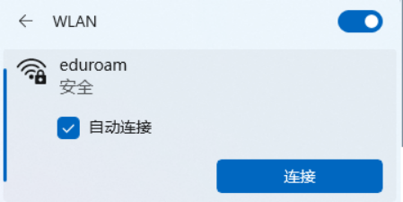 1.在网络列表中选择“eduroam”无线网络,点击“连接”。